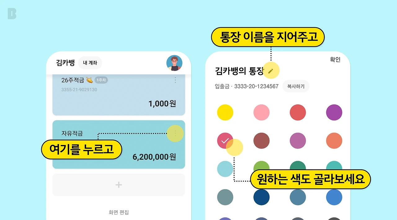 통장 오른쪽 위에 있는 버튼을 눌러보세요. 이름을 바꾸는 것은 기본. 비비드한 컬러부터 파스텔 컬러까지 본인의 취향에 따라 색을 바꿀 수 있습니다. 통장이 여러 개라면 다양한 색조합을 통해서 홈 화면을 취향대로 꾸며볼 수도 있겠죠?
