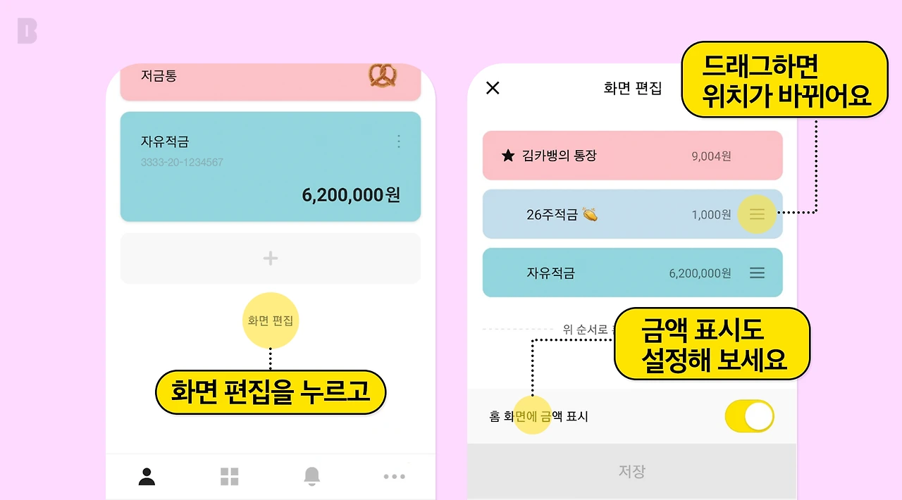 통장 아래 [화면 편집] 버튼을 눌러주세요. 통장 오른쪽 바를 잡고 드래그하면 위치를 바꿀 수 있습니다. 추가로 홈 화면에서 금액을 보고 싶지 않다면, 아래 [홈 화면에 금액 표시] 스위치를 OFF 해주세요.