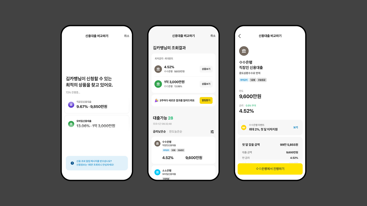 Sena. 카카오뱅크 UX 리서처 분들의 도움으로 기존 대출 비교 서비스를 이용하는 고객이 어떤 특성을 가졌는지, 고객이 우려하는 부분은 무엇인지 등을 확인할 수 있었어요. 이 과정에서 고객분들이 플랫폼에 대한 신뢰 문제를 많이 언급하고 있다는 것을 알게 되었죠. 예를 들어 '대출 조회 시 연락처가 노출되어 대출 문자나 전화를 받게 되지 않을까?'와 같은 개인정보에 대한 걱정을 하고 계셨어요. 그래서 저희는 고객이 대출 조회를 진행할 경우 아주 최소한의 정보만 제휴사에 제공하고, 실제 대출을 실행하게 될 때만 필요 정보를 제공해 고객의 걱정을 덜어드릴 수 있도록 했어요. 그러면서도 카카오뱅크에서의 대출 조회와 제휴사 진조회 심사 결과에 차이가 없도록 서류 심사 과정을 계속해서 고도화해가고 있답니다.