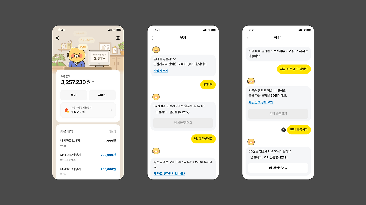MMF박스에서 눈에 띄는 점 중 하나가 '챗봇 인터페이스'이죠. 다른 상품/서비스에 챗봇 인터페이스가 활용된 적이 있지만, 입출금 거래에까지 챗 UI가 적용된 건 처음인 것 같은데요. 챗 UI를 활용하게 된 이유가 있을까요?