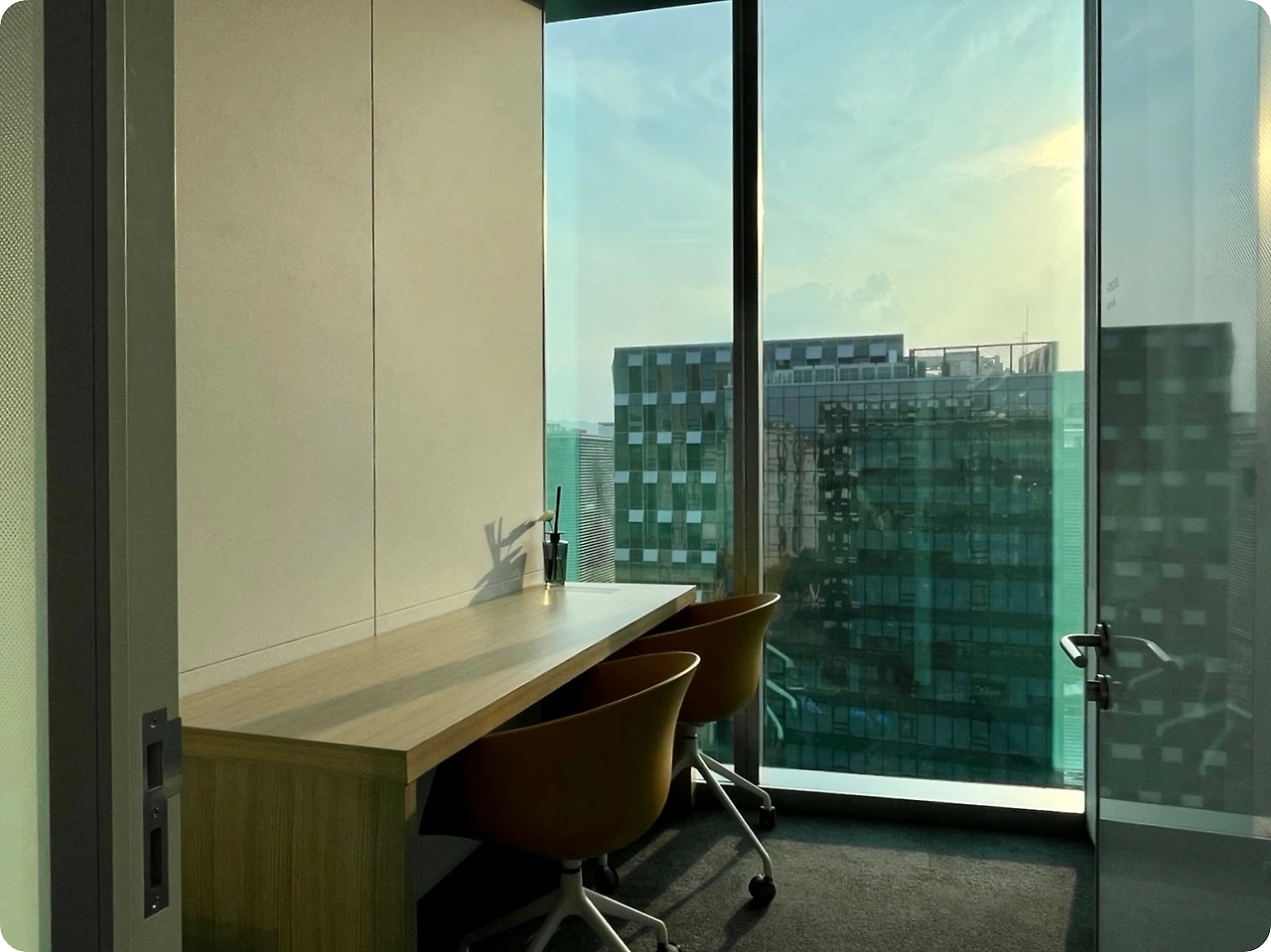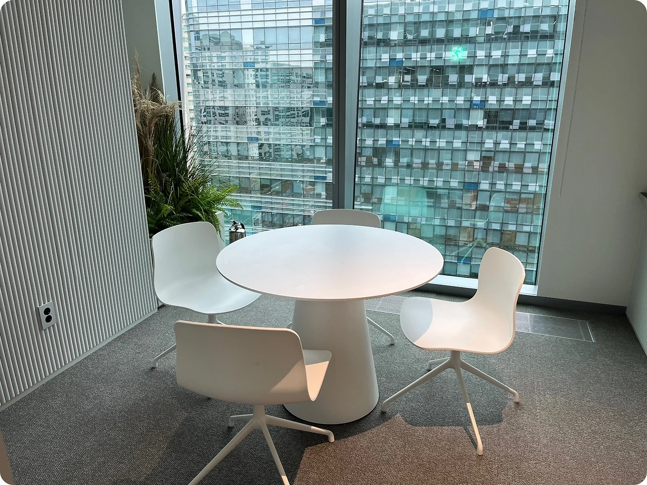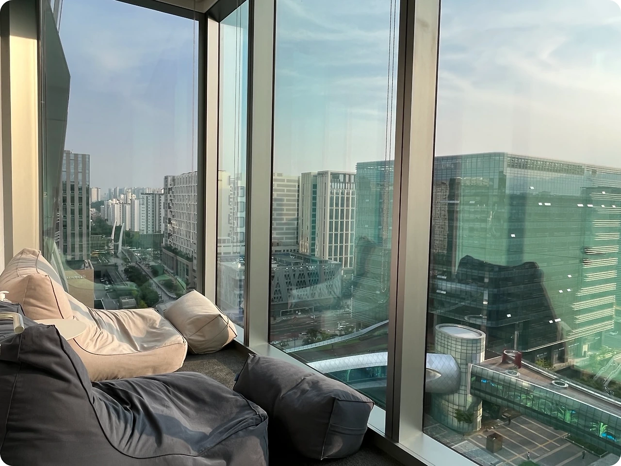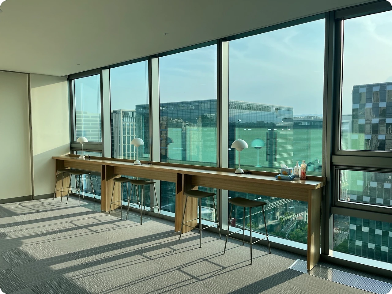 동료와 담소를 나누기에도 좋고 밖에 뷰 보면서 휴식타임 갖기에도 너무 좋은 거 같아요!! 뉴오피스 최고! - Judy