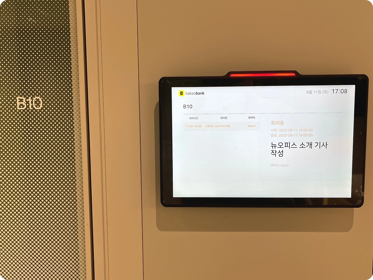 회의실 앞에 부착된 태블릿을 통해 현재 이용 중인 회의실 상황도 알 수 있답니다. :)