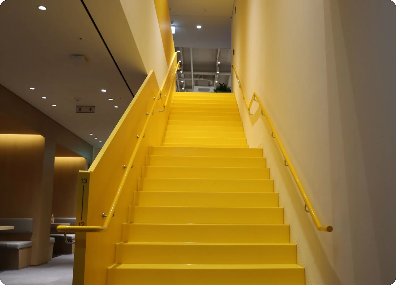 노란색 오픈 계단으로 인해 자유로운 층간 이동이 가능해졌습니다.