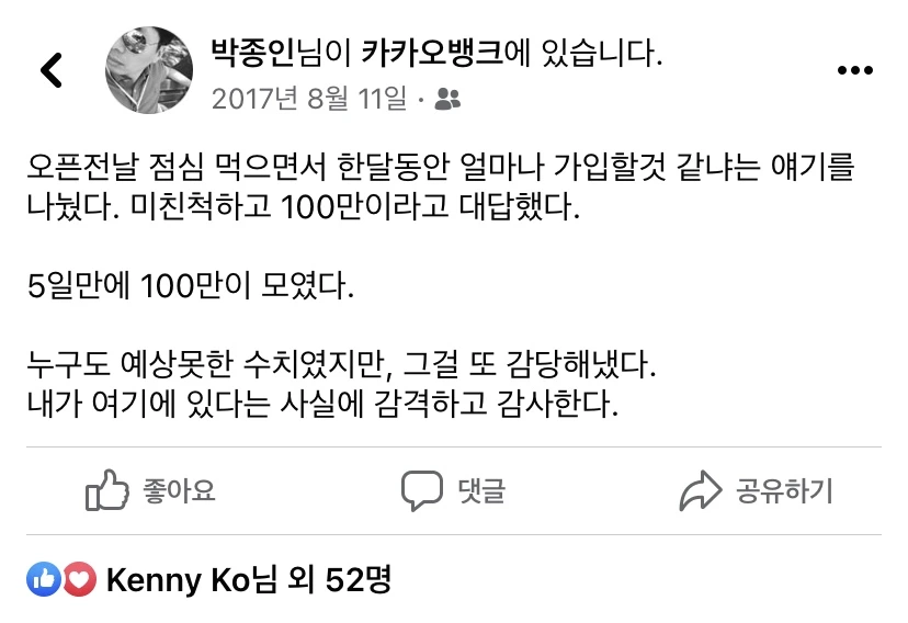 Tony. 오픈 전날인 2017년 7월 26일 점심이었을 거예요. 정신없이 서비스 오픈을 준비하느라 '가입자가 얼마나 될까?'를 구체적으로 생각해 본 적이 없었는데, 식사 자리에서 한 달 동안 몇 명의 고객이 가입할지에 대한 이야기가 나왔어요. 저는 농담 삼아 '100만'이라고 말했죠. 말도 안 되는 숫자라고 생각했거든요.