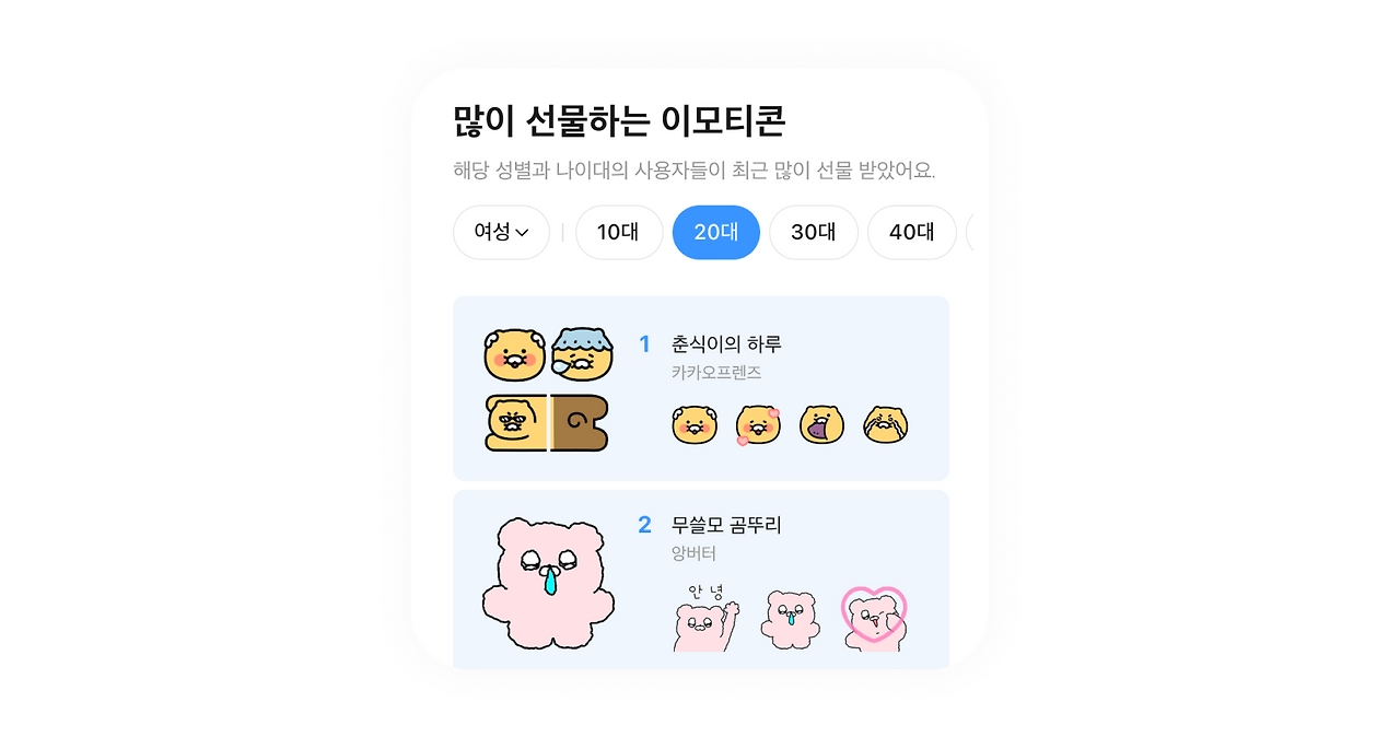 1. 많이 선물하는 이모티콘 : 성별, 연령대 별로 많이 선물 받은 이모티콘을 볼 수 있어요.