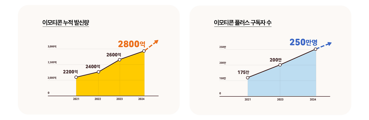 2024년에도 카카오 이모티콘은 많은 사랑을 받았어요. 다양한 이모티콘을 채팅창 가득 보내주신 덕에 이모티콘 누적 발신량이 2,800억 건을 돌파했고, 이모티콘 플러스 구독자 수는 250만 명이 되었거든요! ✨