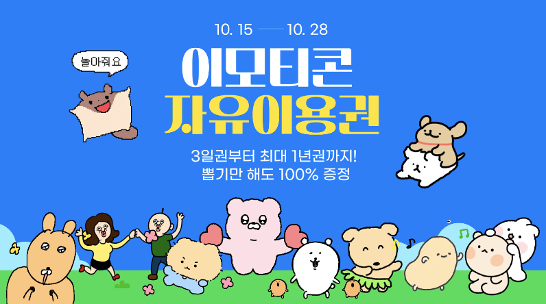 지난 10월 진행되었던 이모티콘 자유이용권 뽑기 이벤트! 약 2주간 진행된 이벤트 기간 동안 1,000만 명에 가까운 분들이 참여해 주셨는데요. 3일부터 최대 1년까지 이모티콘을 무제한으로 이용할 수 있는 자유이용권을 증정하는 이벤트였답니다.