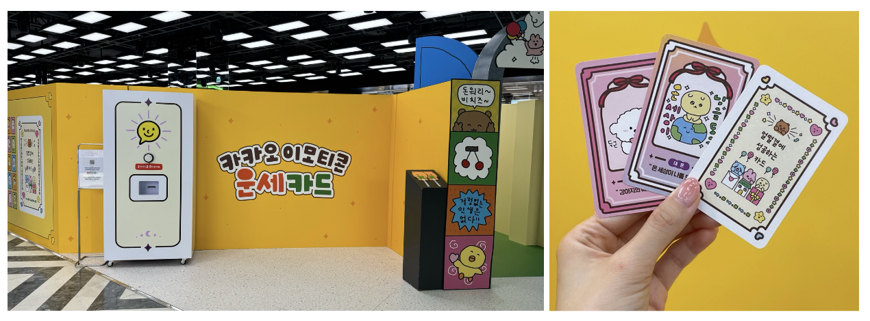 올해 여름, 더현대 서울에서 열린 최고심, 망그러진 곰 팝업스토어와 함께 카카오 이모티콘 운세카드 뽑기 이벤트를 만나볼 수 있었어요. '얼떨결에 성공하는 카드', '원하는 회사 합격' 등 다양한 운세들이 담긴 카드가 66종이나 되었는데요! 운세카드 뒷면에는 미니 이모티콘 이용권 혹은 이모티콘 플러스 이용권이 담겨있었답니다.