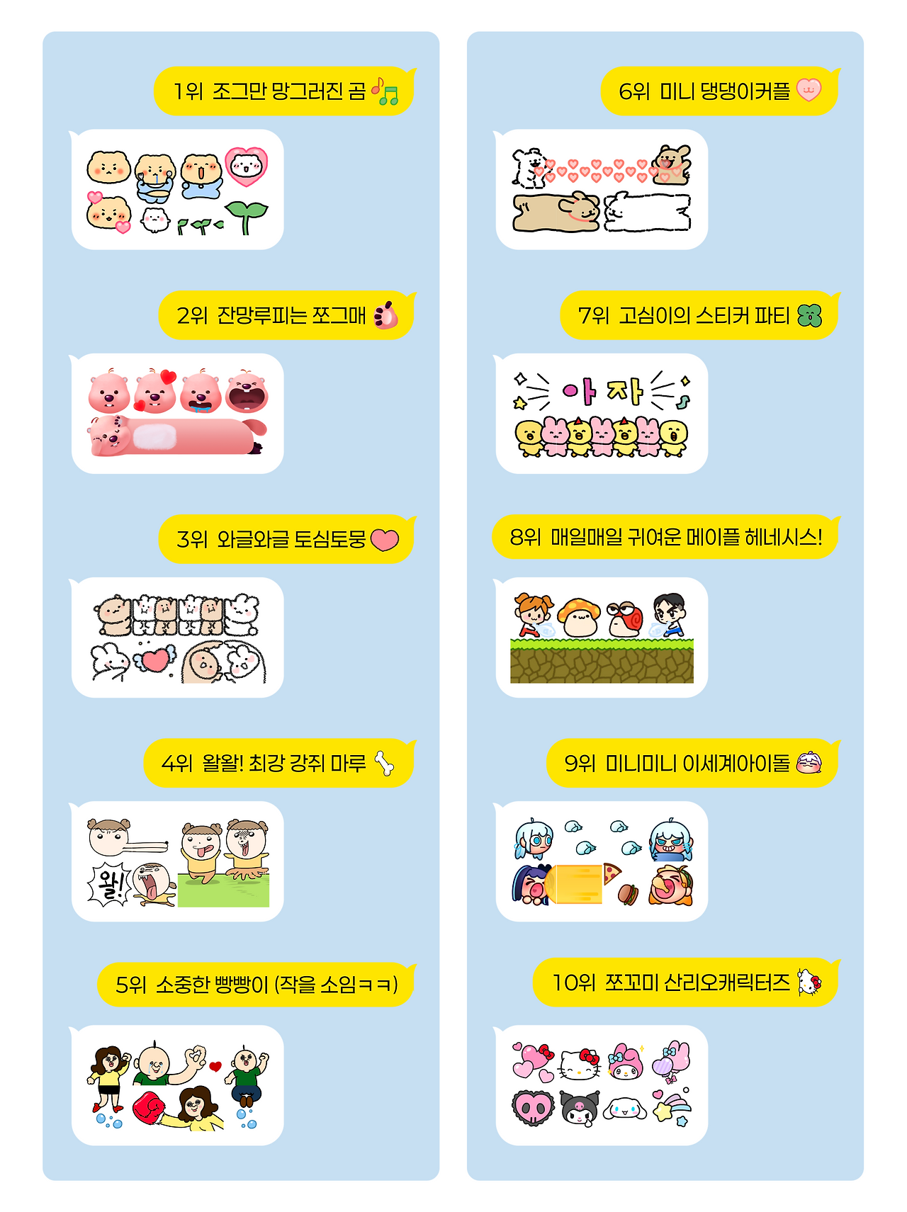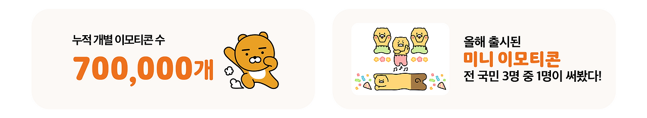 개별 이모티콘 수는 자그마치 70만 개가 되었고 올해 론칭한 미니 이모티콘도 전 국민 3명 중 1명이 사용했을 정도로 큰 사랑을 받았답니다. 모두 여러분 덕분이에요!