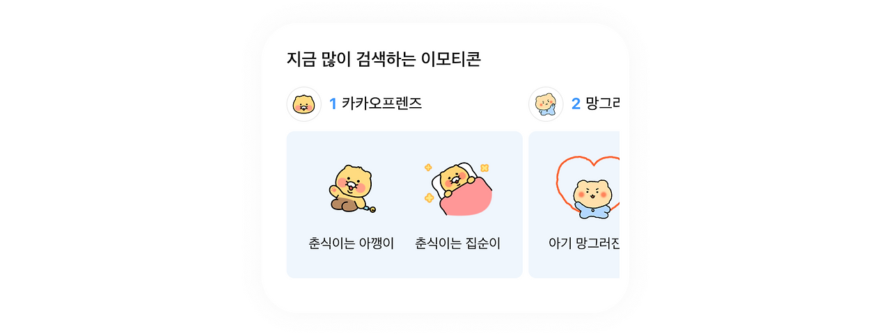 2. 지금 많이 검색하는 이모티콘 : 지금 사람들이 많이 찾고 있는 캐릭터를 확인할 수 있어요.