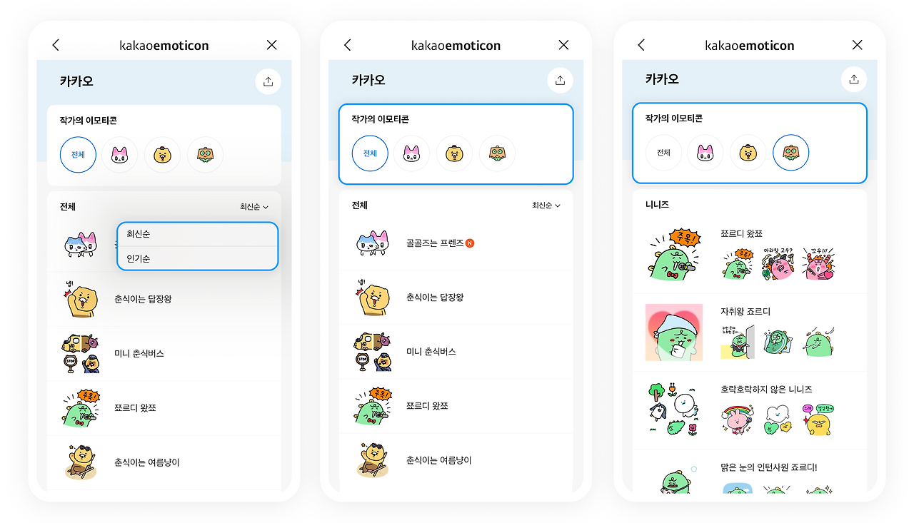 작가페이지에선 해당 작가의 모든 이모티콘을 최신순/인기순으로 정렬해 볼 수 있고, 작가의 이모티콘 영역에서 원하는 캐릭터를 클릭하면 해당 캐릭터의 이모티콘만 모아서 볼 수도 있답니다.