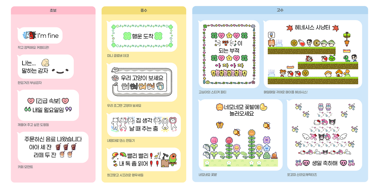 첫 번째는 초보 유형이에요. 텍스트 바로 옆에 스티커 붙이듯이 꾸미는 방식으로 매우 간편해요. 두 번째는 중수 유형으로 단순한 조합을 여러 개 만들어 텍스트 주변을 꾸미는 방식이고, 세 번째는 말풍선에 원하는 대로 그림을 그리듯 꾸미는 고수 유형이에요. 이처럼 다양한 방식으로 나만의 조합을 만들 수 있답니다!