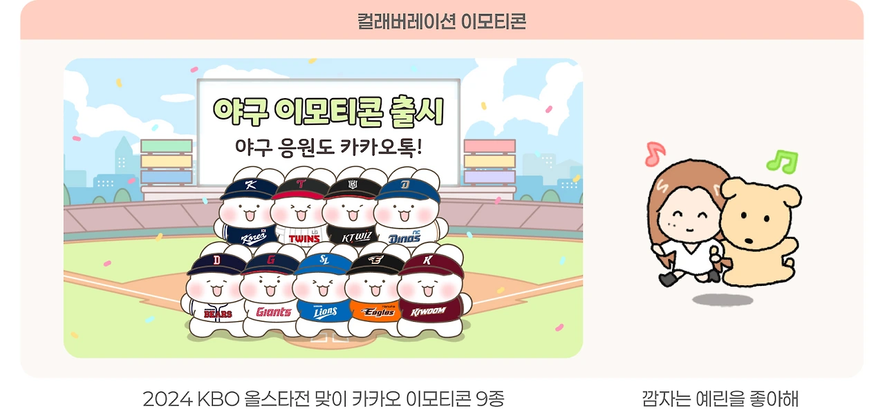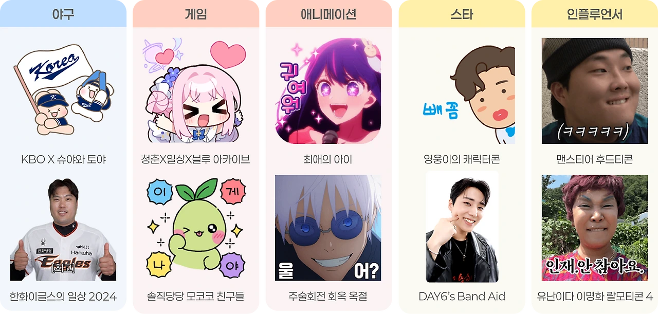 야구 코로나19 이후 시작된 야구 열풍이 다양한 야구 이모티콘 출시로 이어져, 팬덤의 뜨거운 반응을 이끌어냈는데요. 특히 앞서 소개한 ‘KBO X 슈야와 토야’(총 9개 구단별 출시)와 한화이글스 선수들의 모습을 담은 ‘한화이글스의 일상 2024’가 가장 인기를 끌었어요.