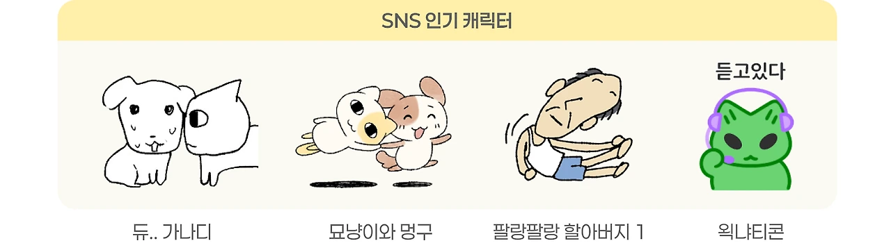 앞서 인기 이모티콘 TOP 10에서 소개 드린 ‘듀.. 가나디’를 비롯해 ‘묘냥이와 멍구’, ‘팔랑팔랑 할아버지’, ‘왹냐티콘’ 모두 SNS 인기 캐릭터라는 공통점을 가지고 있답니다.
