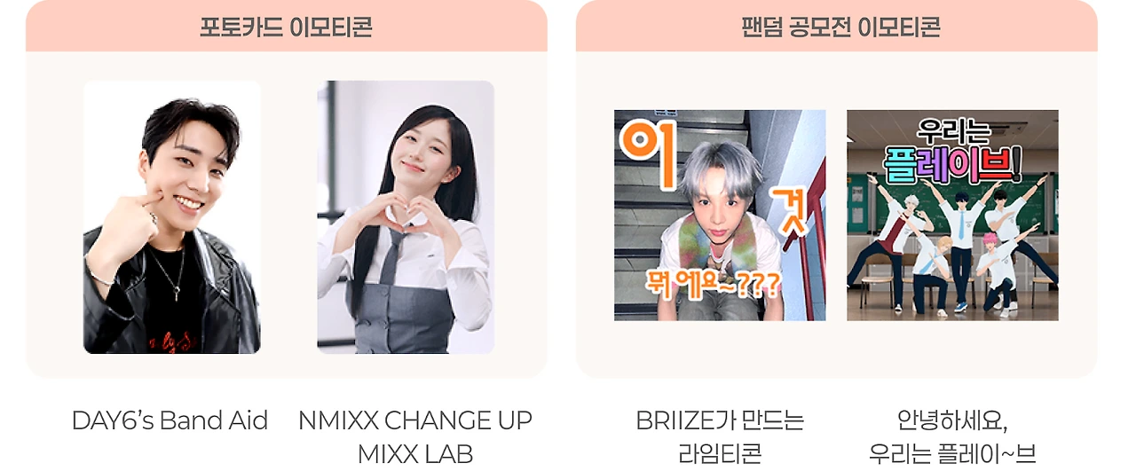 바로 포토카드 이모티콘과 팬덤 공모전 이모티콘인데요. 스타 인기 굿즈인 포토카드를 ‘DAY6’와 ‘NMIXX’ 이모티콘으로, ‘RIIZE’와 ‘PLAVE’ 팬덤 공모전 당선작을 이모티콘으로 출시해 팬들의 소장 욕구를 자극했어요.