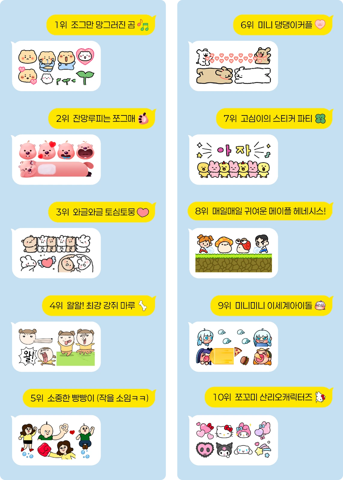 또한 꾸미기 트렌드를 미니 이모티콘에 잘 적용한 ‘고심이’와 ‘산리오 캐릭터즈’는 아기자기한 취향을 가진 분들께 큰 호응을 얻었고 꽁냥꽁냥~ 다양한 애정표현을 자유롭게 할 수 있는 ‘토심토뭉’, ‘빵빵이’, ‘댕댕이커플’도 인기 커플템으로 자리 잡았어요.