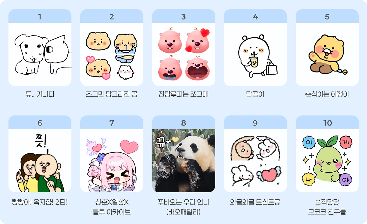 한 해 동안 가장 사랑받은 이모티콘 10종을 소개해 드릴게요. SNS에서 보던 그 짤이 이모티콘으로! ‘듀.. 가나디’가 등장과 동시에 랭킹 1위를 기록했어요.