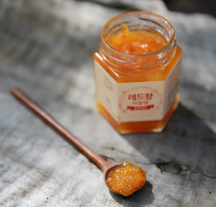 한라봉과 감귤을 교배한 레드향. 친환경 농법으로 재배한 레드향을 껍질채 썰어서 오랜시간 천천히 졸여 만들어집니다.