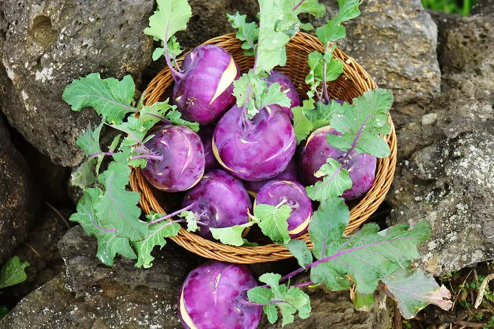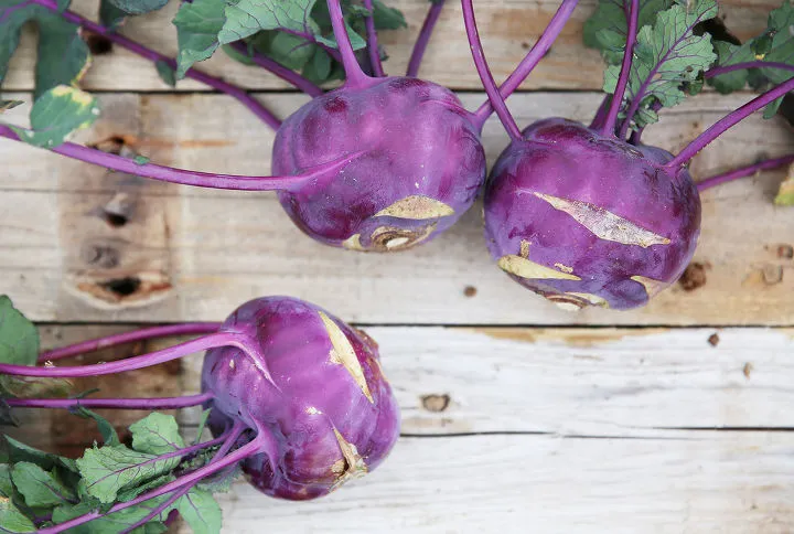 가지, 자색고구마, 그리고 콜라비. 보랏빛을 띠는 이 '퍼플푸드'에는 폴리페놀과 안토시아닌, 암을 예방하는 파이토케미컬이 풍부하게 들어있어 우리의 건강을 지켜주는 고마운 채소입니다. 콜라비에 들어있는 글루코시놀레이트는 무 보다 함량이 월등히 뛰어나고, 붉은빛을 띠게 하는 성분인 안토시아닌은 몸 속 세포의 노화를 유발하는 활성산소를 없애 강력한 항산화제 역할을 하기 때문에 콜라비를 꾸준히 섭취할 경우 30배 이상의 뛰어난 항암 효과를 발휘한다고도 합니다. 칼륨과 칼슘이 많은 콜라비는 몸 속 노폐물과 나트륨 배출을 도와 고혈압 예방에 도움되며, 비타민C가 콜레스테롤 수치를 내려 동맥경화 예방에도 좋습니다.
