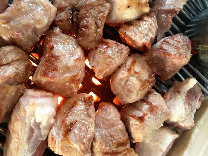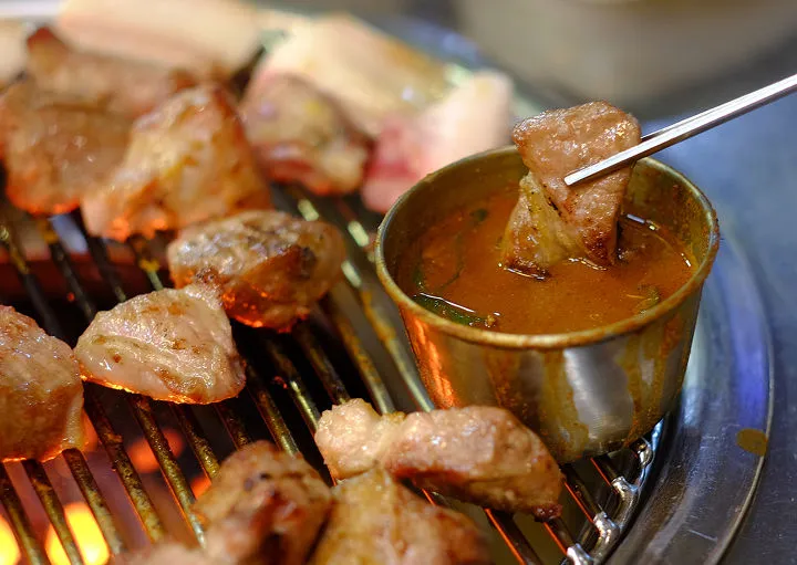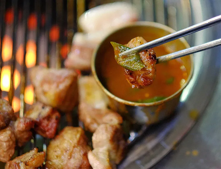 멜이 통째로 들어있는 맛깔스러운 멜젓을 종지에 담고 고추, 마늘, 고춧가루를 넣은 후 소주를 붓고 불판에 올려 끓입니다. 이렇게 준비된 진한 멜젓에 고기를 찍어 드셔 보세요. 무릎을 탁! 치게 되는 맛을 경험할 수 있습니다.