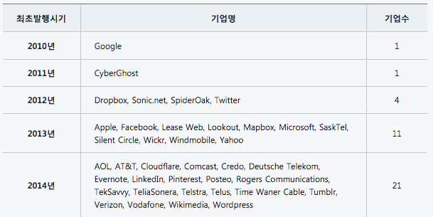 2010년 4월 Google이 IT 기업으로선 처음으로 전 세계 정부로부터 요구받는 이용자 정보와 콘텐츠 제거에 관한 사항을 공개하는 투명성 보고서를 발간했습니다. 이후 투명성 보고서를 발간하는 IT기업들이 점차 늘어났고, 2014년 12월 말 현재 38개 기업이 투명성보고서를 발간하고 있는 것으로 알려지고 있습니다.