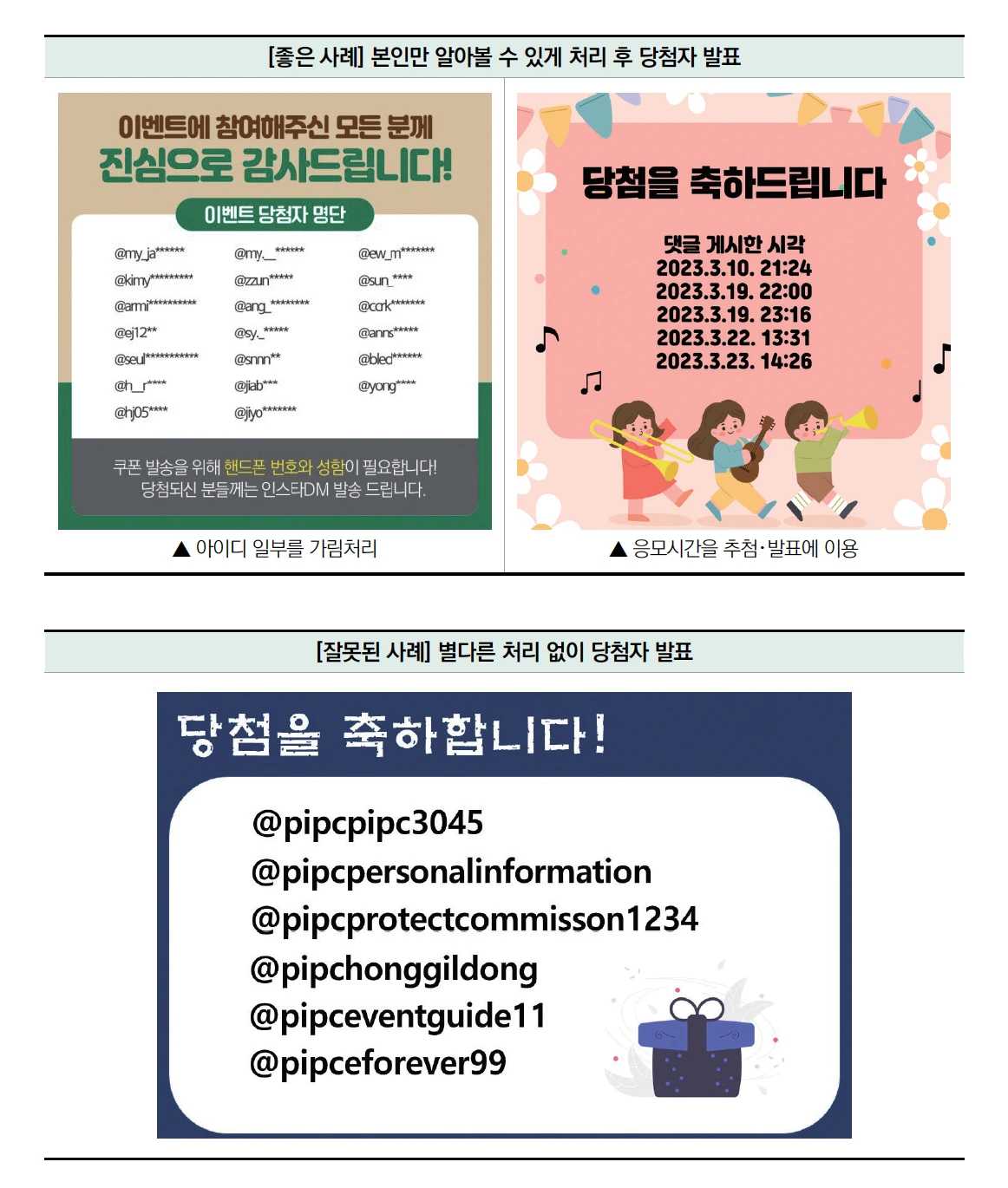 하지만 일부 SNS에서는 개별 메시지 기능이 제한되거나 하루에 보낼 수 있는 메시지 수가 정해져 있어 개별 안내가 어렵거나, 이벤트 성격상 전체 명단 발표가 필요한 경우라면 전체 당첨자 명단을 발표할 수 있습니다. 이때 개인정보 보호를 위해 ID, 닉네임 등을 그대로 공개해서는 안 되며, 당첨자 본인만 당첨 여부를 확인할 수 있는 수준으로 일부 정보를 가림 처리하여 발표해야 합니다.
