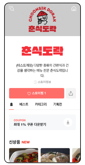 스토어 배경 혹은 프로모션 배너영역에 이미지를 추가하시거나, 스토어 메인컬러의 변화를 통해 나만의 스토어 색과 이미지로 차별화된 스토어 홈 꾸미기가 가능합니다