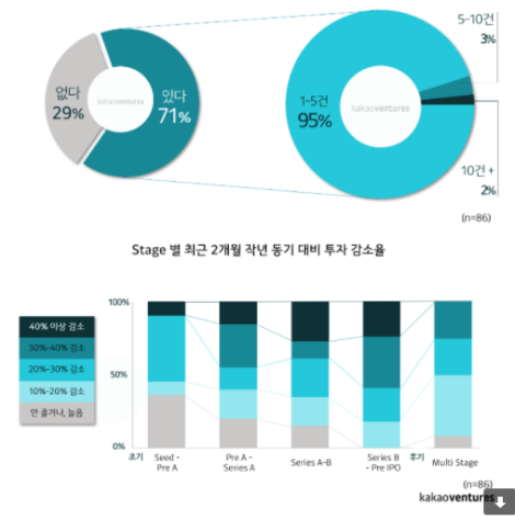 또한, 20% 이상 Valuation이 감소할 것으로 생각되었고 특히 저희 주력 투자 스테이지이면서 후속 투자가 활발한 Pre A ~ Series A 구간에서 밸류에이션 감소 폭이 가장 크게(30%~40%)로 나와 다소 우려되었습니다.