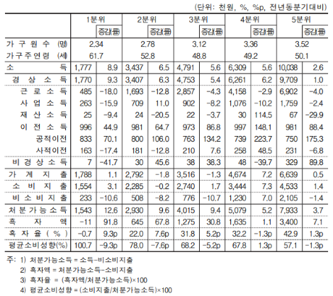 하지만 연령별 소득 증가율의 경우는 대부분이 40대 이상의 연령층에 집중되어 있습니다. 이는 1) 20~30대 초반의 우수한 일자리 부재, 2) 공적 이동 소득의 대부분이 장년층에 집중, 3) 여성 일자리 정책 확대로 40대 이상의 여성 근로 소득 증가 등을 이유로 보고 있습니다.