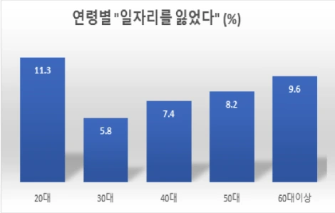 또한 경기도 공공보건의료지원단의 조사에 따르면 코로나로 일자리를 잃었다는 경우는 전체의 9.3%로 나타났으며 20대가 11.3%로 가장 높게 나타나 불안한 고용 형태로 코로나의 직격탄이 되었다는 것을 확인할 수 있었습니다.