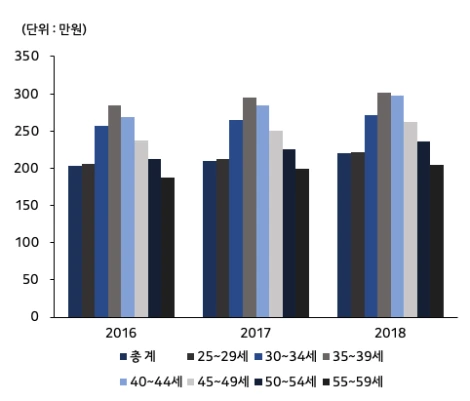 국내의 경우 25세에서 ~39세 까지 임금이 상승하는 경향을 보이며, 이후 정년 및 은퇴 등으로 임금이 감소하는 경향을 보이고 있습니다.