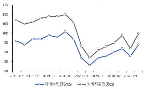 코로나19 신규 확진자가 크게 증가한 4월부터 소비자동향지수는 큰 폭으로 하락했습니다. 5월부터 확진세가 안정화되면서 회복 국면을 보였지만, 여전히 코로나 이전 수준으로의 회복은 되지 않은 상황입니다.