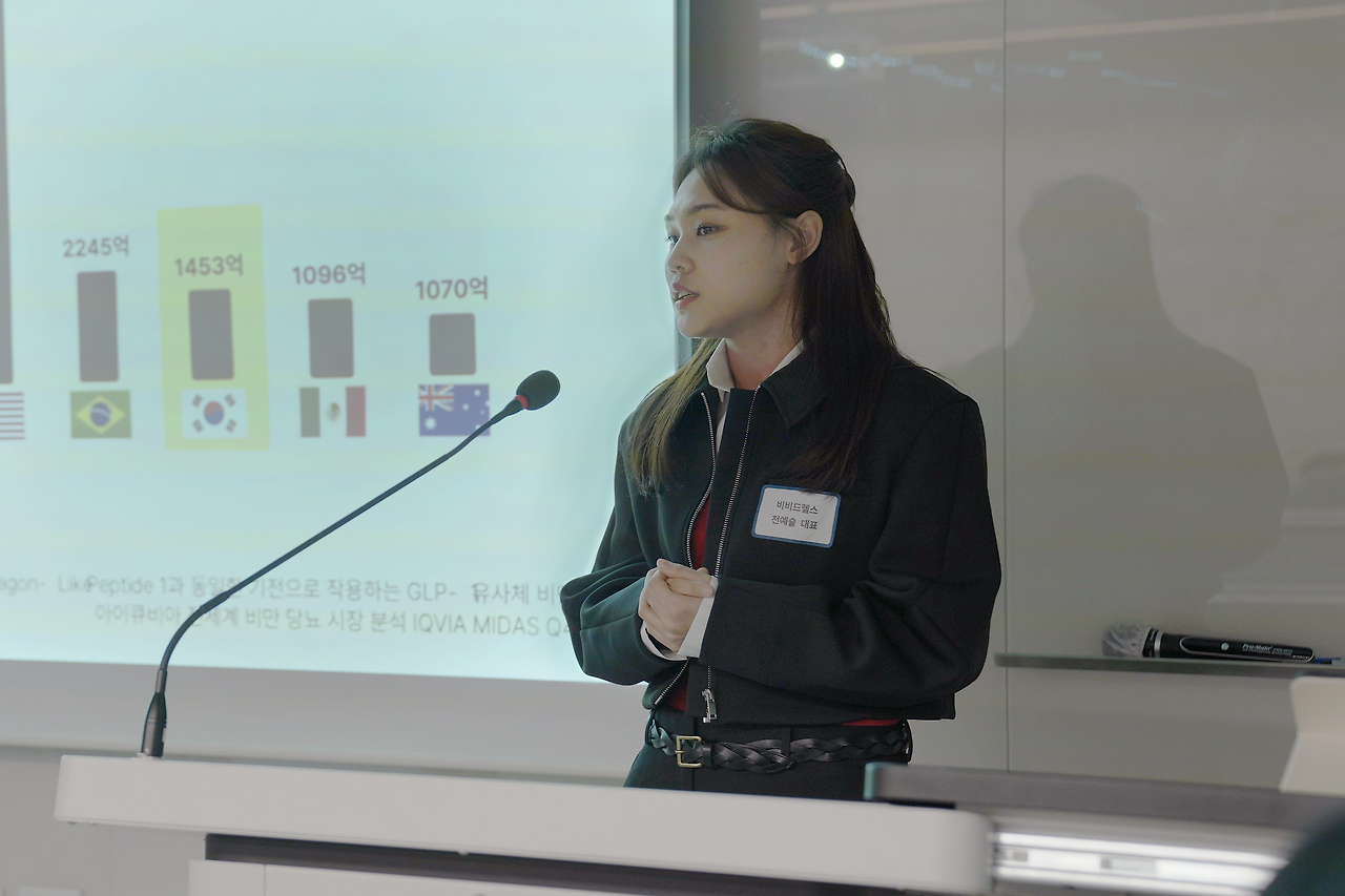 정주역 심사역의 뒤를 이어 비비드헬스의 천예슬 대표님께서 마이크를 잡았습니다. 비비드헬스는 비만 치료제 관리 플랫폼 ‘삐약’을 운영합니다. 지금까지 비만 치료는 운동이나 식단을 통한 해결이 대부분이었습니다. 하지만 이러한 시도는 개인의 의지와 직결되어 있기 때문에 실패 확률이 높습니다. 이러한 상황 속 등장한 새로운 선택지가 바로 비만 치료제 즉, 비만약입니다.