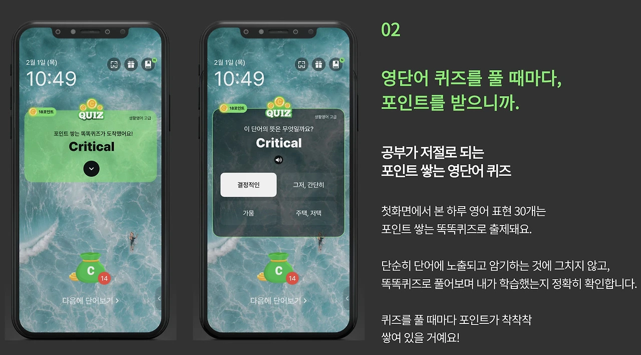 영어 학습 앱 ‘똑똑보카’는 학습 후 영단어 퀴즈를 풀 때마다 포인트를 지급합니다. 이렇게 번 포인트는 편의점 기프티콘으로 교환이 가능합니다. 즉각적인 보상과 더불어 보상의 효용이 바로 체감되게 하여 유저들에게 지속적인 동기부여를 할 수 있습니다.