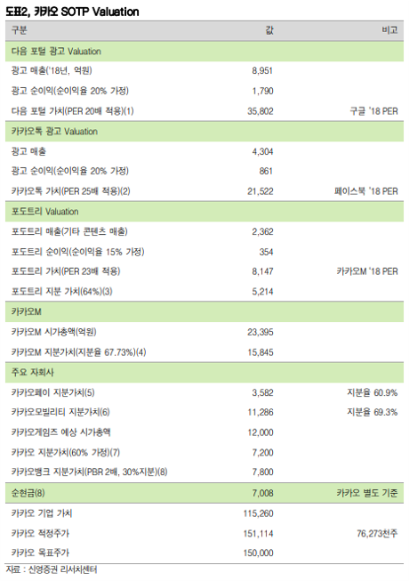 이러한 정보들이 종합되어 향후 실적을 추정하고, 적절한 밸류에이션을 적용해 적정 주가를 찾고 투자 의견을 제시하게 됩니다. 아래는 제가 마지막으로 작성했던 카카오의 Valuation입니다. 2018년이라 지금이라 차이가 많네요. (그때 카카오 주식만 사놓았어도 4배가 넘게 수익이 발생했네요 ㅠㅠ 시간을 돌리고 싶네요)