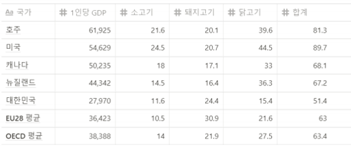 주요 OECD 국가별 1인당 연간 육류 소비량 (단위 : kg)