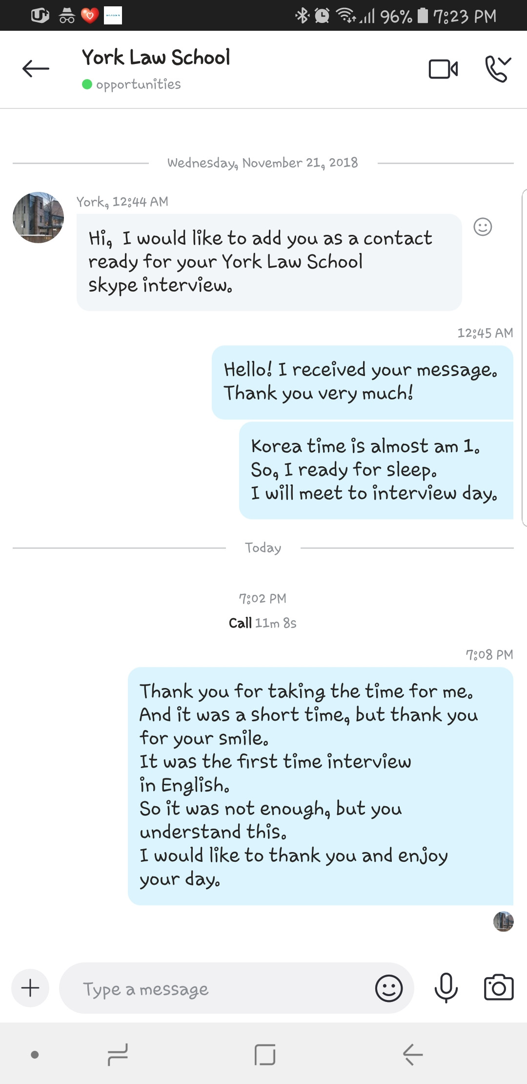 York law school 입학 허락을 받기 위해 했던 인터뷰