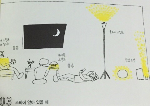 행동에 따른 조명 활용법도 나와 있고 방구석에 조명을 활용해서 더욱 멋스럽게 연출할 수 있는 조명 활용법도 나와 있다.