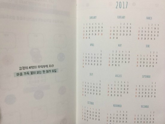 2017년 달력이 나온다. 달력이 있는 건 나쁘지 않지만 이 감정 다이어리북의 경우에는 만년 다이어리 형태로 나왔어도 좋지 않았을까 싶다. 연도를 특정하는 게 아니라.