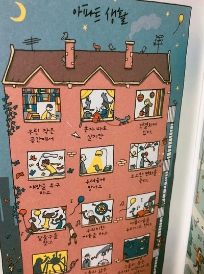 아파트는 공동 주택이다. 여러 사람이 공간을 나눠서 사용하는 곳이 아파트이다. 저자는 ‘아파트 생활’이라는 글과 그림에서 아파트 생활에 대해 이렇게 정의한다.