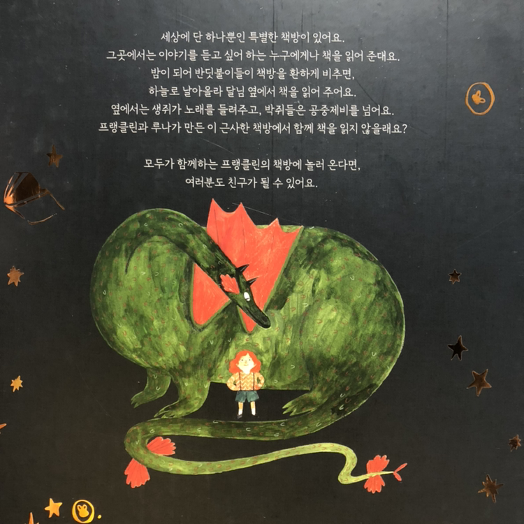 프랭클린과 루나는 자신들이 알고 있는 이야기를 더 많은 사람과 나누고 싶은 마음에 프랭클린의 등 위에 날아다니는 책방을 만든다. 그리고 마을로 내려가게 된다. 마을 사람들은 여전히 프랭클린을 무서워하지만 함께 책을 읽자는 제안에 조심 조심 프랭클린의 등 위로 다가선다.
