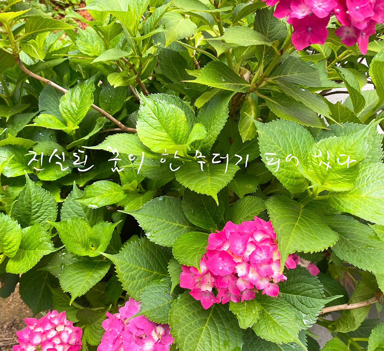 수국의 꽃말은 진심이고 핑크색 수국의 꽃말은 ‘진실된 꿈’이라고 한다. 어떤 진심이 저곳에 꽃을 피우게 했을까. 어떤 마음으로부터 피어나는 것. 사랑이 있어 꽃도 피었을 것이다.