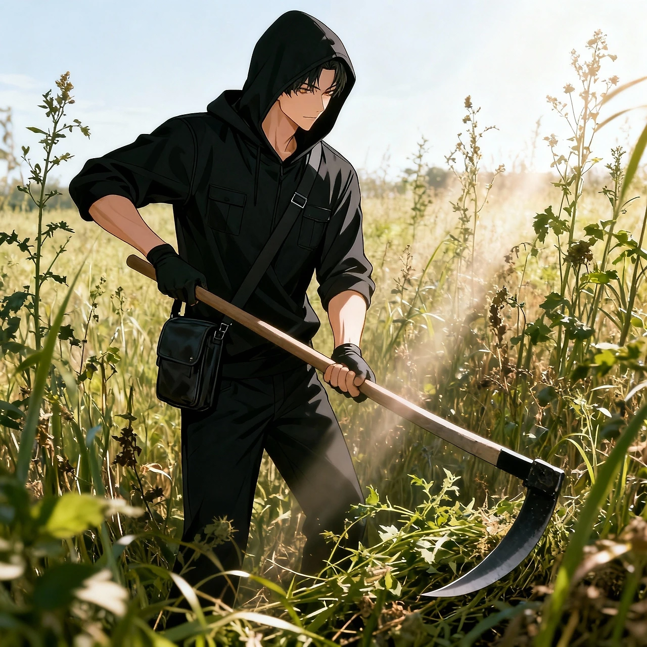 김데스는 크로스백처럼 메고 있던 커다란 낫으로 사람 키만큼 자란 잡초를 베며 말했다.