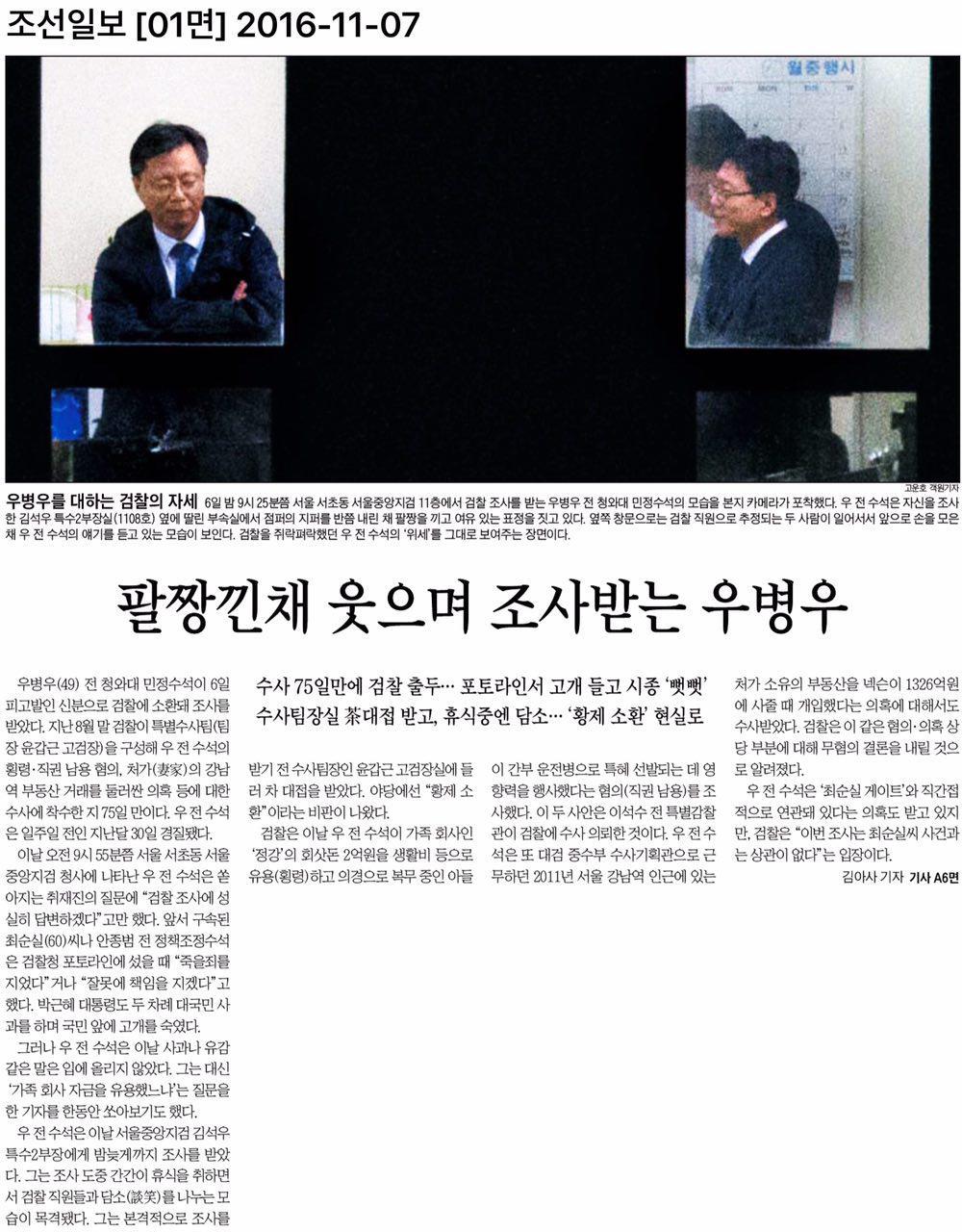 오늘 조선일보 1면 사진기사로 전국이 또 한번 시끄러웠습니다. 검찰에 소환된 우병우 전 민정수석이 여유로운 모습으로, 두손을 공손히 모은 후배 검사(?)와 이야기 나누는 그 사진 기사입니다.