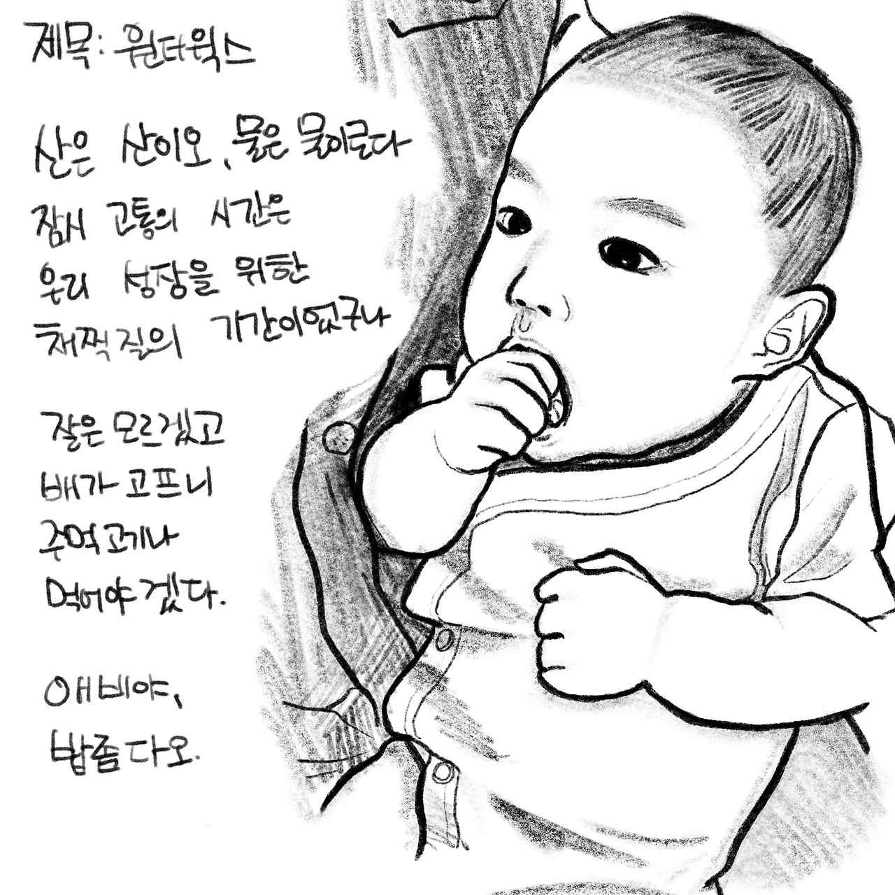 어쨌든 아기는 점차 안정을 되찾아 가고. 분유도 제대로 된 걸 먹었으니. 결국 쪽쪽이 대신 자기 손을 촵촵 입에 가져가는 주먹고기 타임을 선보여주시며 훈훈하게 주말을 마무리. 하지만 월요일에 엄빠 모두 앓아누웠다는 게 함정. 아기야 아빠가 항상 미안해.