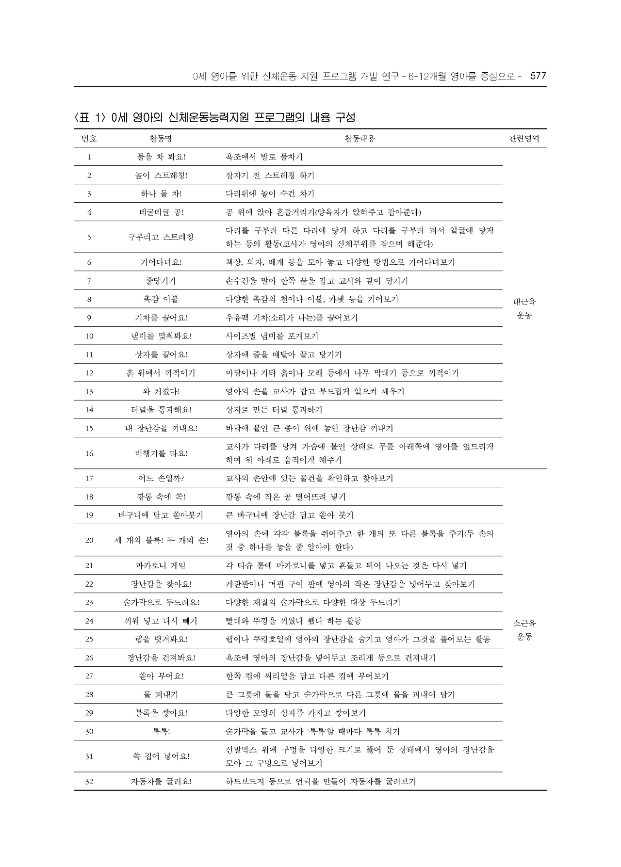 병원에 갈 정도는 아니지만 그래도 걱정이 된다는 부모님도 많을 것이다. 그래서 자료를 찾던 중 구한 '0세 영아를 위한 신체운동 지원 프로그램 개발 연구'라는 학술자료에 포함된 프로그램을 공유한다(노희연, 2014). 대근육 소근육으로 나뉘어 있어 보기에 좋다. 하루에 하나씩만 하고 놀아도 한 달이 훌쩍 갈 테니 참으로 훌륭하지 않은가!