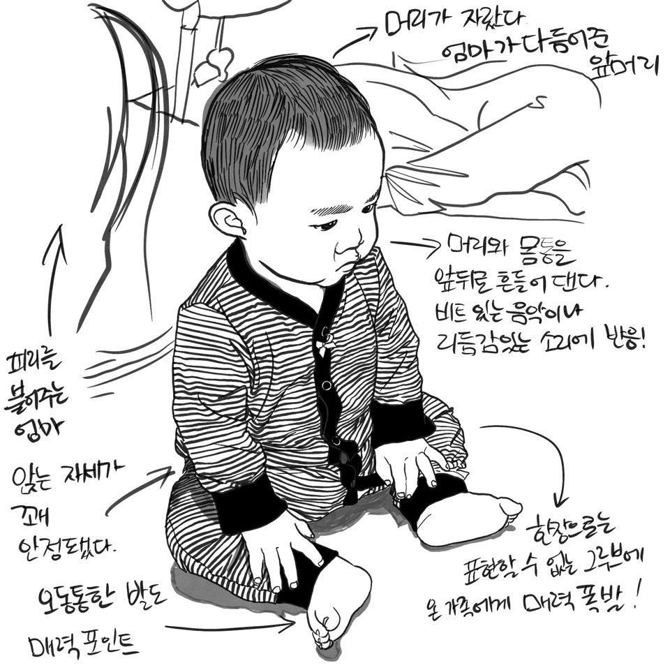 며칠이 지나니 춤사위는 더욱 거칠어졌다(?). 누워서 뿐만 아니라 앉아서도 까딱까딱. 비트가 있거나 리듬감이 있는 소리만 들리면 고개를 까딱까딱거리느라 정신이 없다. 심지어 엄마가 피리를 불어줘도 신나서 까딱까딱. 느린 박자에는 반응이 없다 적당히 빠른 속도의 음악이 나오면 또 까딱까딱. 황당한 모습에 본가 처가 할 것 없이 최고의 스타로 등극하고야 말았다.