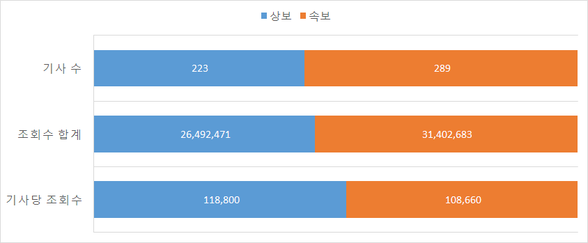 속보의 승리입니다. 일단 많이 본 뉴스에 오른 기사 수에서 상보보다 속보 기사의 숫자가 많습니다. 조회수 합계도 당연히 높겠죠. 물론 기사 1개당 조회수는 상보 기사가 속보보다 아주 소폭 높습니다만, 딱 봐도 이 정도 차이는 통계적으로 유의하지 않을 겁니다. 여기에 상대적으로 종합 및 상보 기사가 속보보다 더 품이 들어간다는 점도 고려할 필요가 있죠. 결국 속보가 상보보다 '조회수 획득'에 유리하다는 것은 어느 정도 맞는 말로 생각됩니다.