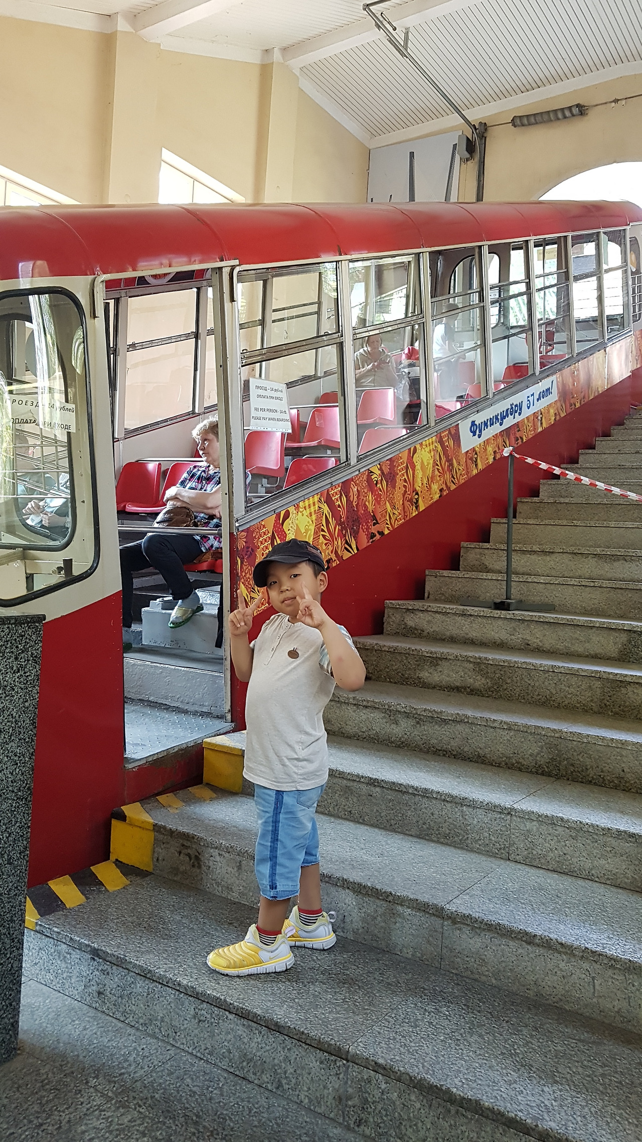 푸니쿨라는 독수리 전망대까지 연결되는 경사진 전차였는데 아이에게 태워주면 좋아할 거라는 확신으로 여행에 넣었던 나의 야심작이었다. 역시 아이는 처음에 경사면을 타고 올라가며 흔들리는 전차를 처음 타봐서 무서워했지만 그 작은 스릴을 즐기며 잘 탔다. 내려서 전망대 구경했는데 독수리 전망대에서는 블라디보스토크의 금각교(졸로토이 다리)를 축으로 시내가 시원스럽게 보였다. 러시아의 샌프란시스코라고도 불린다는데 꼭 그 느낌이 났다. 전망대에서 함께 전경을 감상하고 사진도 찍다가 다시 시내로 내려가려고 푸니쿨라를 타러 갔다. 그런데 아이가 너무 좋아해서 한번 더 왕복으로 탔다. 손님도 거의 없어서 내려올 때 한 번은 요금 받는 분과 오직 우리 둘 만 탔다. 편도 1회 타는데 둘이 28 루블(500원)이라 부담이 없어서 여러 번 탔다. 내려서 다시 숙소로 오는데 아이가 조금 힘들어해서 한참 목마 태우고 안아주고 하면서 걸었다.