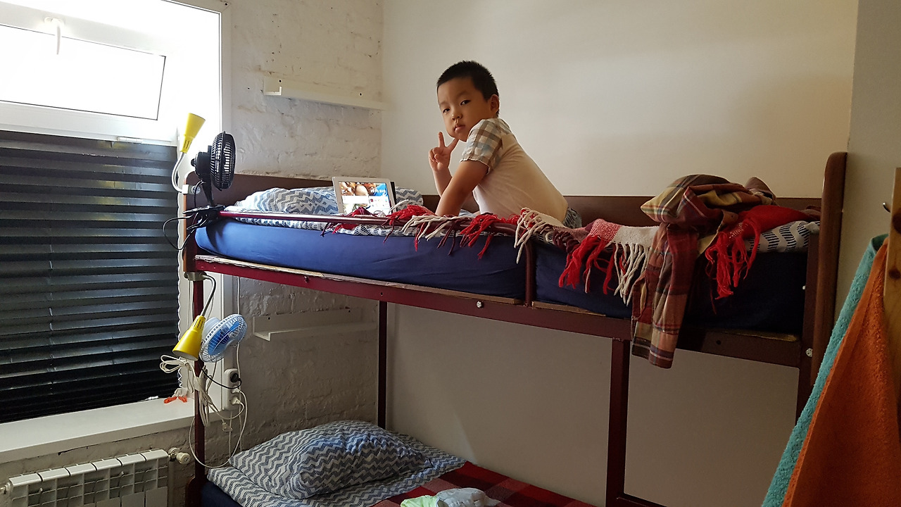 숙소에서 손만 씻고 바로 근처 식당에서 저녁 식사를 했다. 굴라쉬(러시아 매운 수프), 송아지 스테이크, 게살 샐러드, 딸기 셰이크 등을 주문했는데 못 먹어 본 송아지 요리가 있고 자리도 자유롭게 앉아서 아이와 편하게 식사할 수 있어 가격이 총 2,200루블 나왔는데 팁을 500루블 드렸다. 아이는 먹다가 졸려해서 결국 잠이 들어버렸다. 그래서 결국 좋아하던 디저트는 못 먹고 숙소에 와서 씻었다. 다행히 우리가 이용할 때 아무도 없어서 편하게 샤워장을 이용할 수 있었다. 이때 바닥이 조금 미끄러워 정강이를 세게 부딪혔는데 한국으로 돌아와서도 한 동안 멍이 들어있었다. 씻고 나서 다들 여유롭게 쉬었는데 아이는 소시지를 까먹으면서 만화 영상을 신나게 보았다. 만족했던 하루였는데 단 하나 공공장소에서 화장실을 쓸 때 아이 혼자만 둘 수 없어서 내가 화장실을 사용할 때에도 안까지 계속 같이 다니니 아이가 고역이었다.